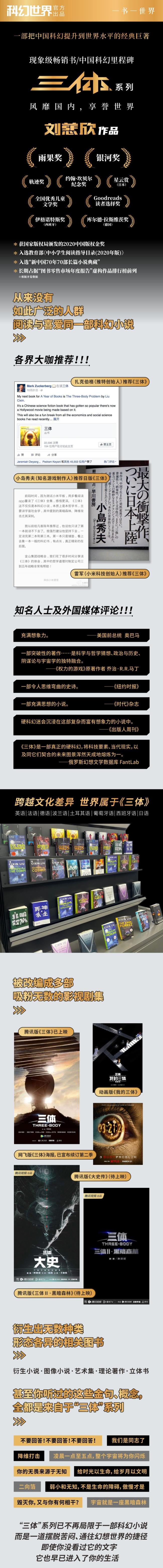 刘慈欣的作品宏伟大气、想象绚丽,既注重**空灵与厚重现实的结合,也讲求科学的内涵和美感。具有浓郁的中国特色和鲜明的个人风格。为中国科幻确立了一个新高度。本书讲述的是光年尺度下的生存推理,虽说这本书是科幻小说,但书中的推理成分是如此之多,以致于我在写这篇书评的时候都要小心翼翼不能泄底。在三体人准备侵略地球的这段时间里,人类当然不会坐以待毙,利用三体人思维透明的致命缺陷,制订了神秘莫测的“面壁计划”,精选出四位“面壁者”,希望以此展开对三体人的反击……