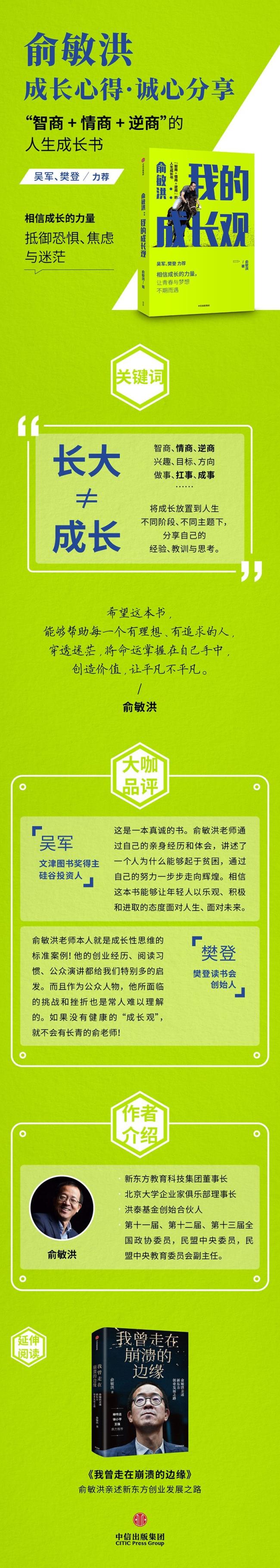 回想我在农村历经三年高考考入北大,留在北大任教后又离职开始做外语培训,以及创办新东方的点点滴滴……在这个过程中,我有学生在学习阶段的感悟和困惑,有创业者创业的艰辛和精彩,也有身为教育者看到问题的焦虑,以及父亲这个角色带给我的体验……所以我把一路走来的细碎、点滴汇聚总结,把不断 新的看法分享出来,以此为成长解惑一二,希望能够帮助一些在成长过程中遇到问题的学生探索走出迷茫的路径,也希望能够帮助走入社会的朋友们不断打磨自己,以成长为盔甲,来面对生活与职场的重重压力。与此同时,我也希望能够让一些家长走出孩子成长教育的误区,能够让孩子拥有 好的成长空间。